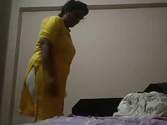 A hot Indian aunty wears a saree while she is alone in the house. A snoop cam records her every move and we lay eyes on her unbutton her blouse and expose her big melons.